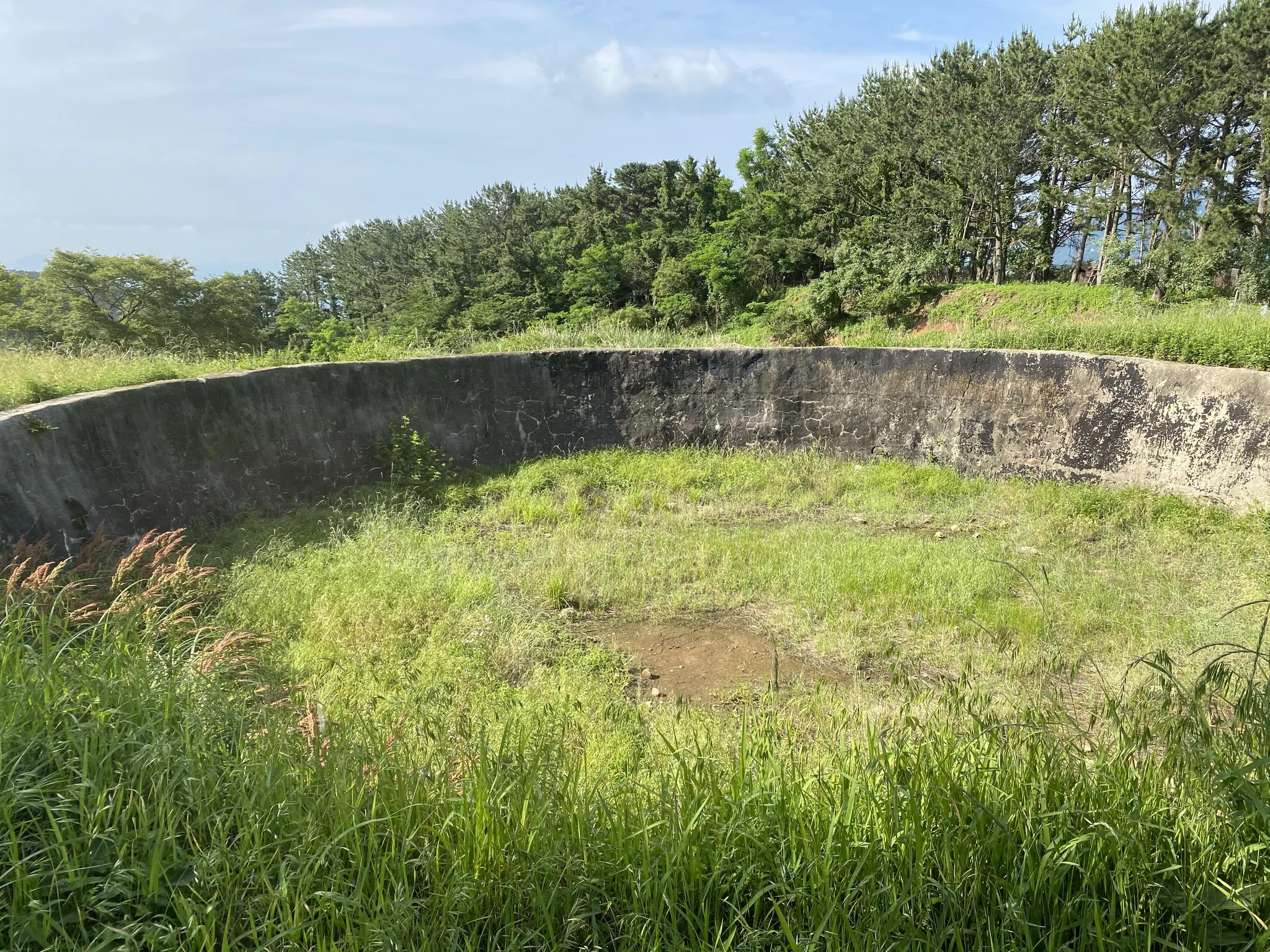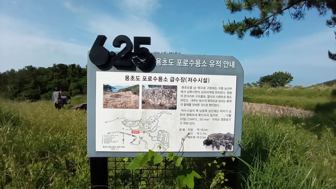 포로수용소를 건설하기 위해서는 우선 두 가지를 확인해야 했다. 첫 번째 는 미군의 상륙수송선(LST)이 접안할 수 있을 만큼 수심이 충분히 깊은지, 두 번 째는 충분한 식수가 있는지다. 머릿돌에서 산 방향으로 올라가다 보면 오른쪽에 있는 커다란 타원형의 구덩이를 만나게 된다. 2.5m 정도의 높이로 테두리를 둘러 콘크리트를 세웠다. 물을 저장하던 곳이었다. 한 번은 작은 노루가 빠졌다가 나오 지 못해 죽은 적이 있다고 한다.