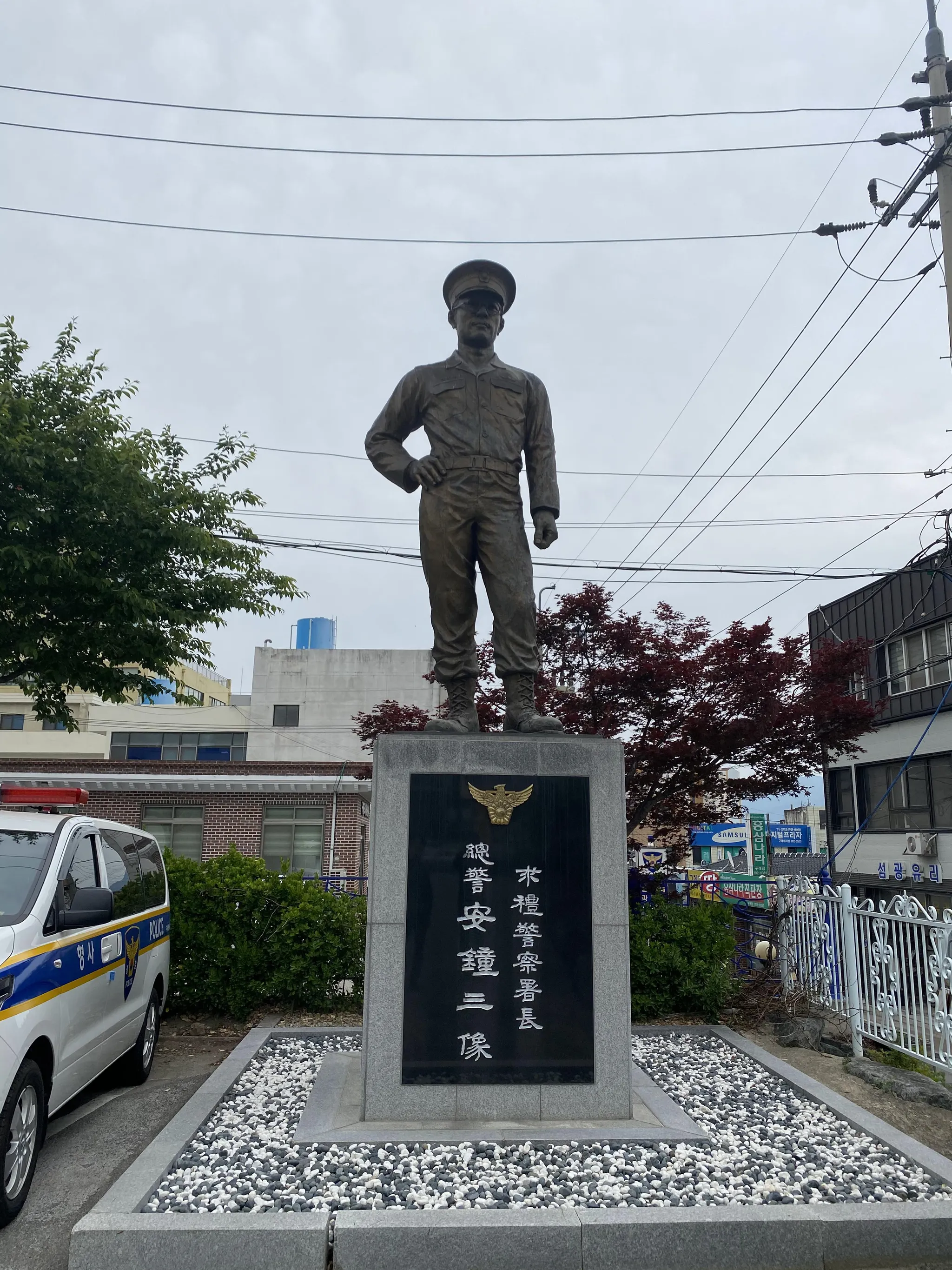 안종삼 서장의 동상. 동상 양 옆에 그의 약력과 국민보도연맹원을 석방한 이야기가 적혀 있다.