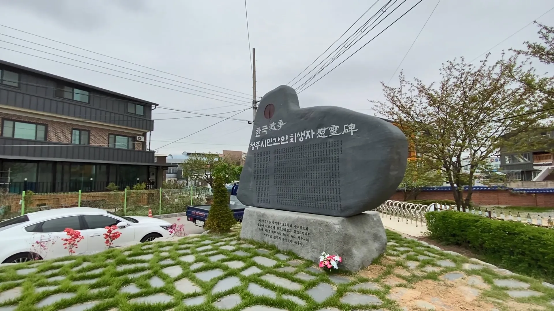 청주민간인희생자위령비. 오창창고 학살 피해자와 함께 청주시 학살 피해자 의 이름이 적혀 있다.