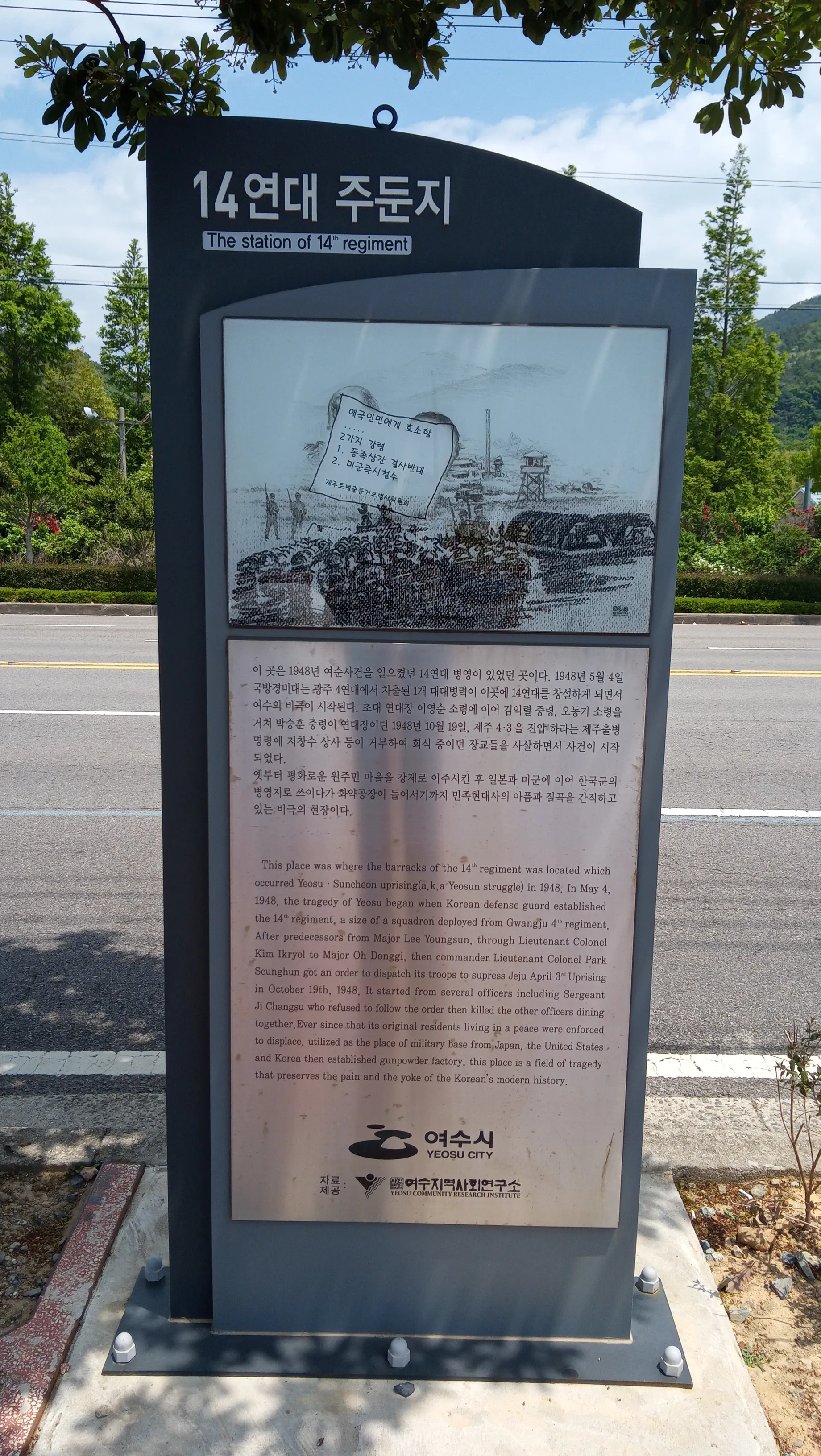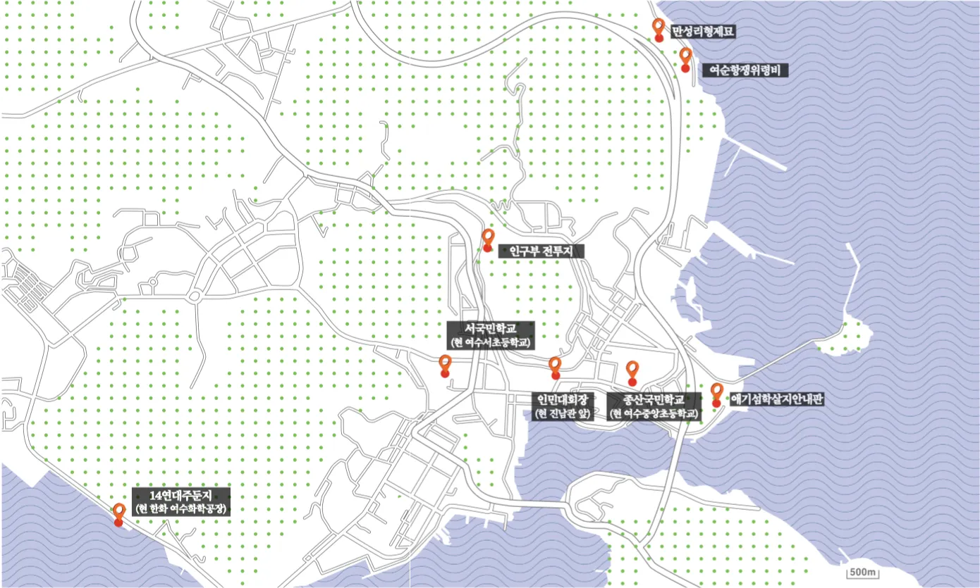 14연대 주둔지에는 이후 결핵환자 자활촌이 들어섰다가 지금의 한국화약 공장이 자리했다. 일본군이 쓰던 곳이라 그런지 봄이 되면 벚꽃이 흐드러지게 핀다고 한다. 14연대 주둔지 앞의 대로는 화약 공장이 들어서며 새로 건설한 것이다. 도로명을 공모했는데, 여수 시민사회는 여순항쟁의 뜻을 기리자는 차원에서 ‘통일로’라는 이름을 제안했다고 한다. 제안은 받아들여지지 않았고 지금의 신월로라는 이름으로 정해졌다. 여전히 ‘반란’이라고도 불리는 여순항쟁이라는 역사적 사건은 언제쯤 제대로 된 이름을 갖게 될까.