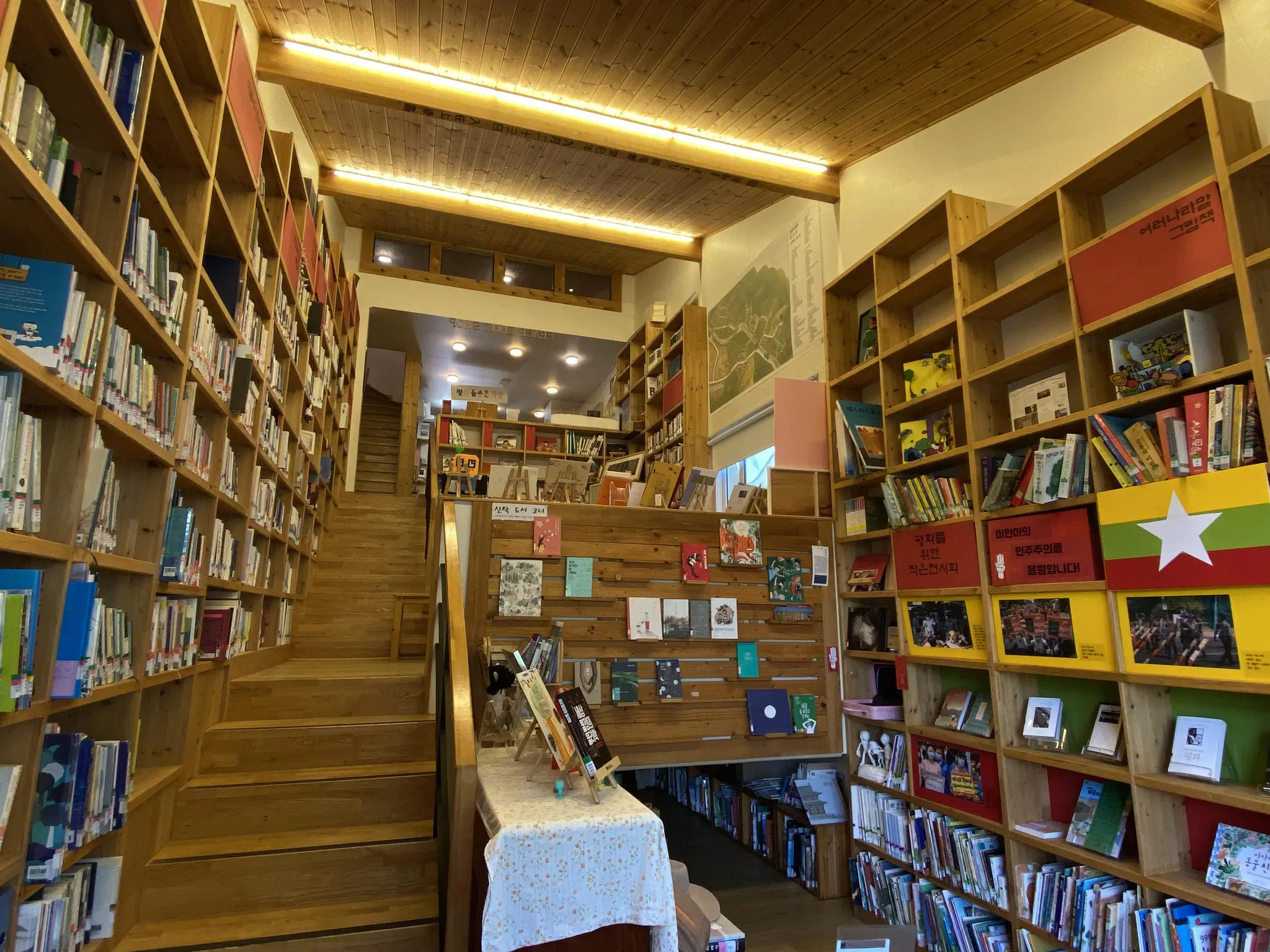 평품집 1층으로 들어가면 오른쪽에 전 세계 대량학살 사건을 다루는 제노 사이드 전시관이 있다. 규모는 크지 않지만, 제노사이드만을 주제로 한 전시관은 전국에서 이곳이 유일하다. 산비탈에 집을 지은 탓인지 1층으로 들어왔음에도 아 래로 내려가는 계단이 있는데, 계단 양옆으로 책이 빼곡히 꽂혀 있다. 평품집에서 운영하는 평화도서관의 장서들로, 모두 인권과 평화, 녹색의 가치를 담은 책이다.