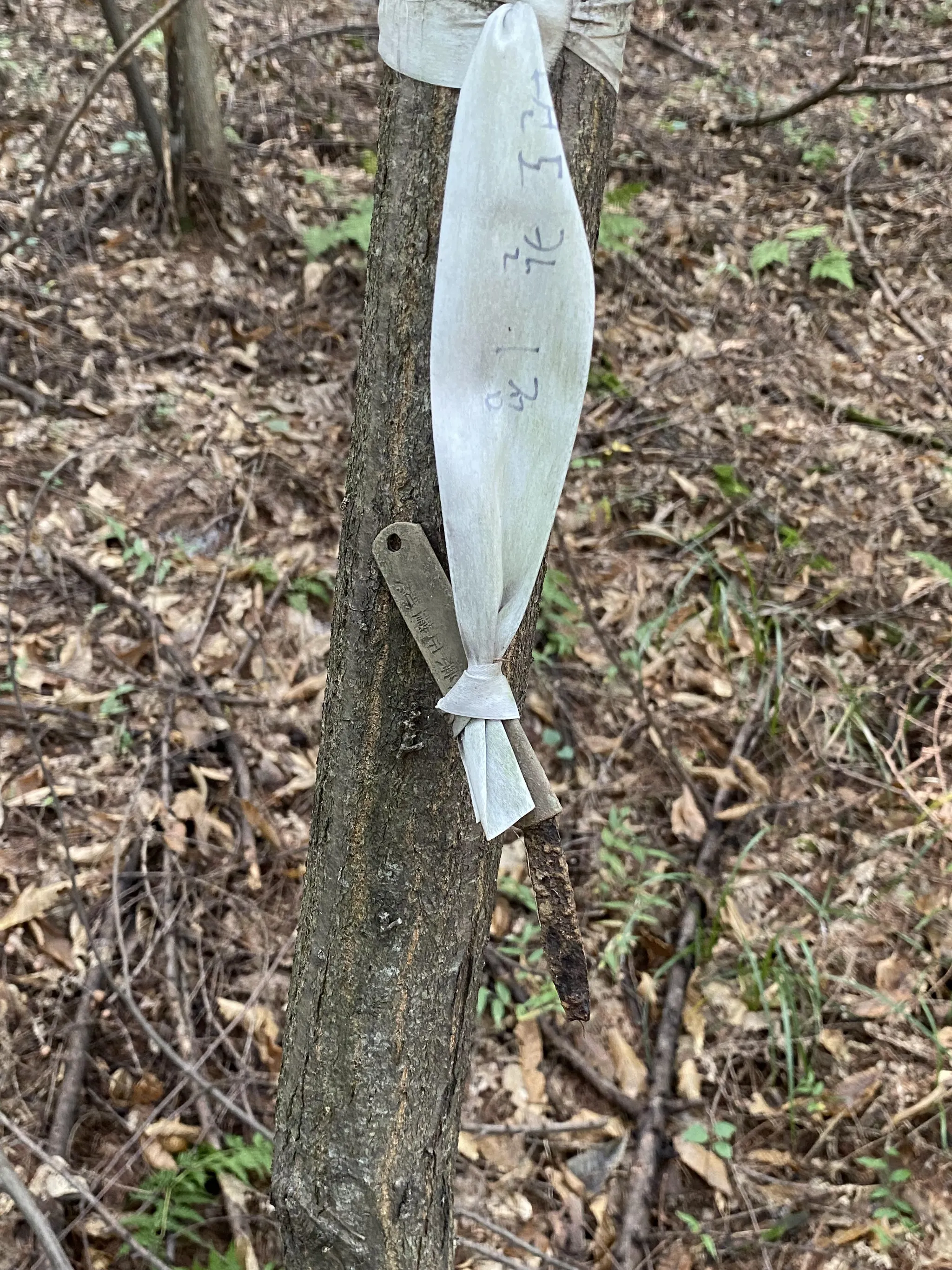 유해발굴 당시 발굴된 면도칼을 나무에 걸어놓았다.