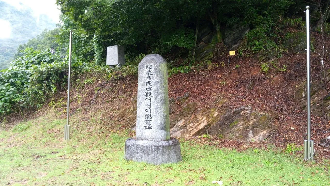 위령비가 있는 언덕 바로 앞의 밭이 첫 번째 학살 현장이다. 이곳에 마을 주민을 모아 놓고 총격을 가했다. 생존자는 살려주겠다고 말하자 살아남은 자들이 몸을 일으켰다. 군인들은 다시 총을 쐈다. 두 번째 학살은 위령비 부근에서 벌어졌다. 잠시 나가 있다가 마을로 돌아오던 청장년과 겨울방학으로 수업이 일찍 끝나 돌아오던 학생들이 학살의 대상이 되었다. 채의진 선생은 그들 중 한 명이었고, 거기서 형을 잃었다.