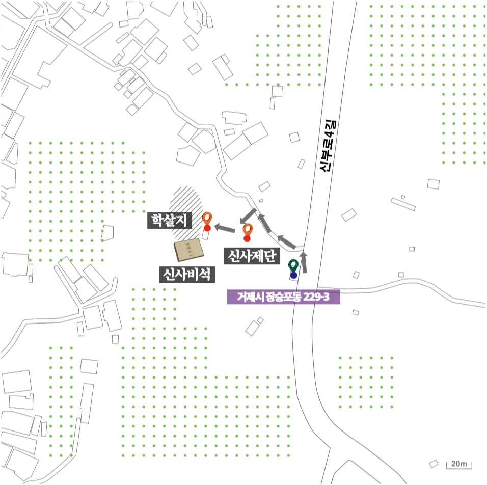 1949년 5월 장승포 신사 터에서는 빨치산 5명이 마을 사람들 앞에서 즉결 처분으로 총살당했다. 제대로 된 조사와 재판은 없었다. ‘빨갱이가 되면 이렇게 된다’는 본보기 학살이었다. 현재 학살 현장은 밭이 되어 울타리를 넘어 들어가야 한다. 당시 신사에 있던 제단석이 밭 한쪽에 놓여 있다.