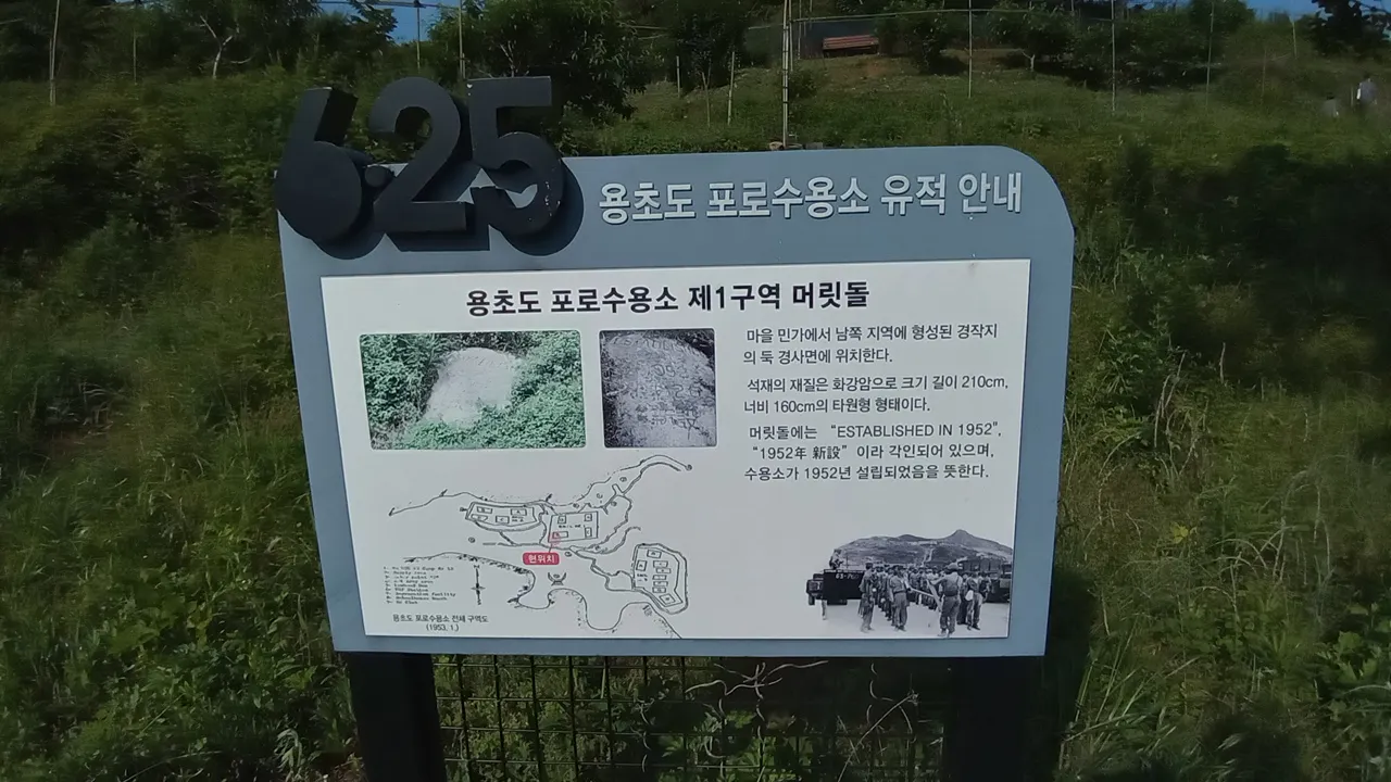 용초도 답사에서 처음 만나게 되는 곳이다. 포로수용소를 만들며 미군은 머릿돌을 새겼다. 현재는 개인 사유지에 있지만, 용초도를 여러 번 방문한 전갑생 선생 덕에 들어갈 수 있었다. 방문을 하려면 사전에 용초 마을회관에 문의하는 것 이 좋다.