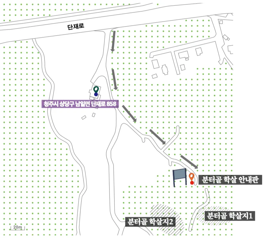 분터골은 충북지역에서 가장 많은 사람이 죽은 곳이다. 1,000여 명 이상이 학살된 것으로 추정된다. 일주일 동안 매일 트럭이 드나들며 청주지역 보도연맹원과 청주형무소 재소자를 실어 날랐고, 총소리가 끊이지 않았다고 한다. 분터골은 큰길에서도 한참을 걸어와야 하는 외진 곳에 있었다. 진실화해위원회가 세운 안내판과 그 옆 한국전쟁전후민간인피학살자전국유족회가 세운 하얀 원혼비만 이곳이 학살지임을 알려주었다.