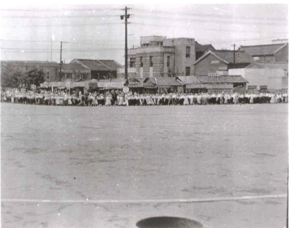 태평로에서 대치 중인 경찰과 시위 군중. 시위 군중은 길 건너에 무리 지어 있다. 군중이 등지고 선 왼쪽의 건물이 삼국상회(현 현대오일뱅크 주유소 위치),오른쪽의 건물이 조선운송주식회사(현 온그린푸드 위치)다.