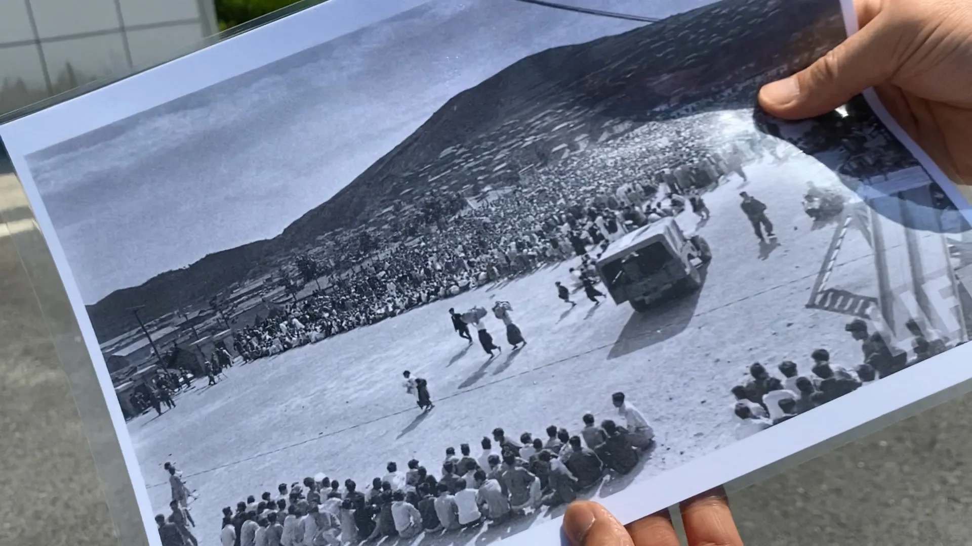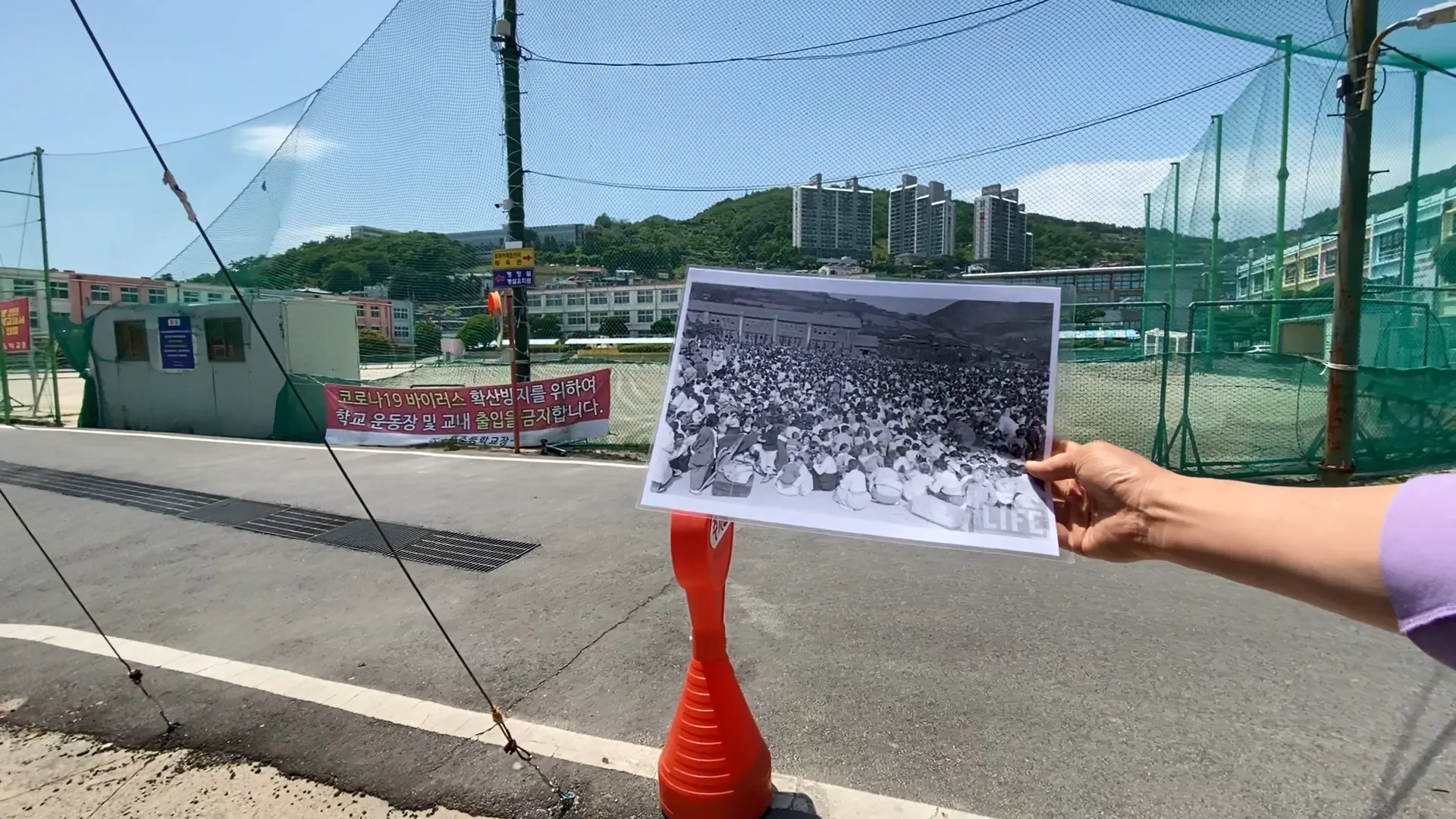 라이프지 기자 칼 마이던스가 찍은 당시 서초등학교의 사진. ‘부역자’ 혐의로 끌려온 사람들이 서국민학교 운동장에 모여 있다. 당시와 지금의 산세가 똑같은 것을 볼 수 있다.