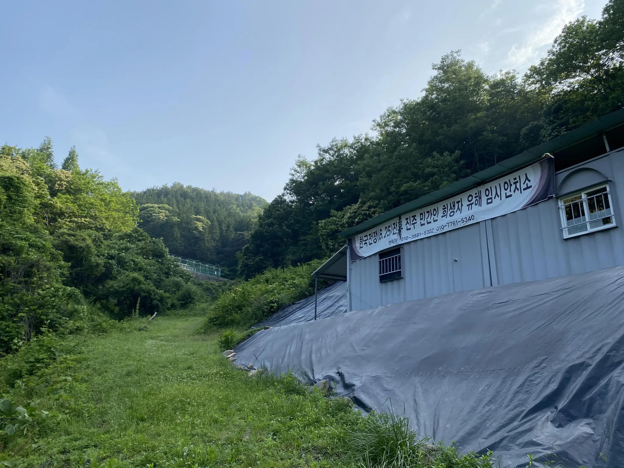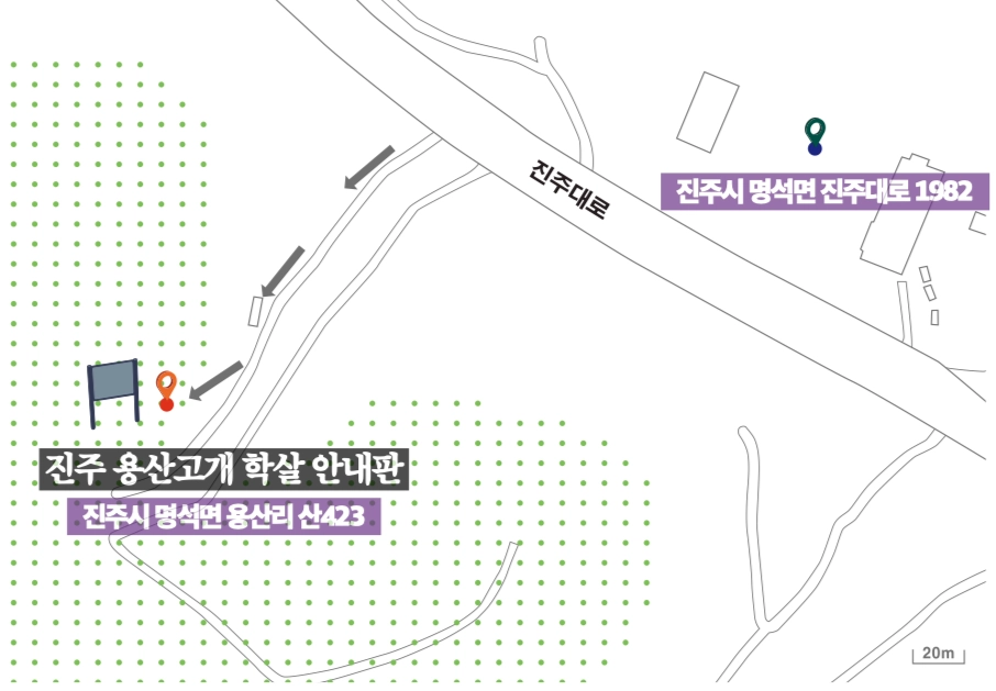 용산고개는 국도변 갓길에 차를 세우고 산을 올라가야 나온다. 길 오른쪽에 보이는 컨테이너에는 마산 진전면 여양리에서 학살된 진주형무소 재소자와 진주지역 국민보도연맹원의 유해가 안치되어 있다. 보통 한국전쟁기 민간인 학살 피해자의 유해는 세종시 추모의 집에 안치하지만 유족들이 조상의 유해를 가까이 모시고 싶다는 마음에 이곳에 그냥 그대로 두었다고 한다.