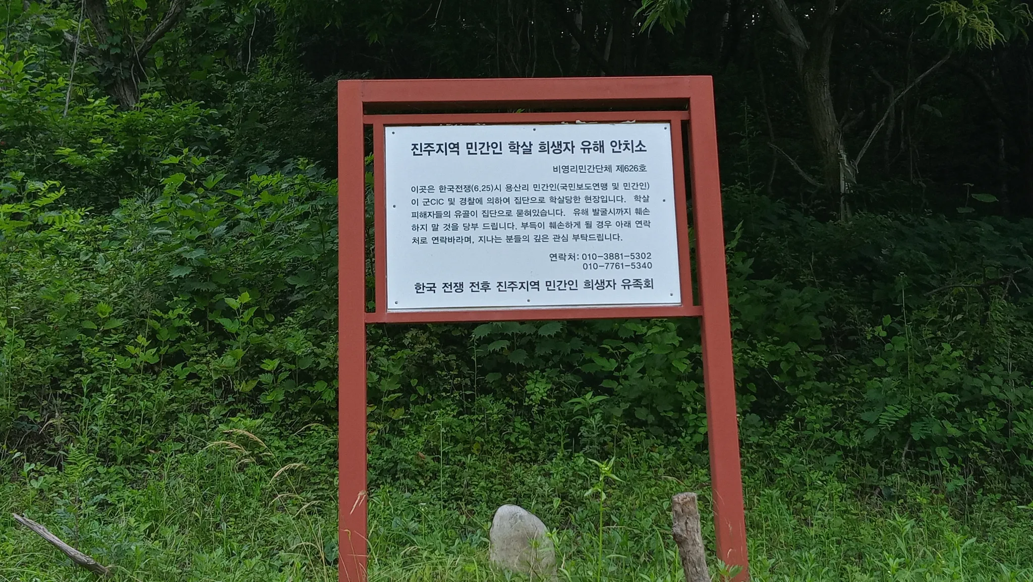 용산고개 인근 지역은 진주에서 가장 큰 규모의 학살이 있었던 곳이다. 이곳 역시 국민보도연맹원과 진주형무소 재소자에 대한 학살이 있었다. 인근 주민들이 동원되어 시신을 매장했다. 당시 매장에 참여했던 주민들은 시신 대부분이 40대 미만의 남성이었으며, 700여 구의 시신을 매장 했다고 증언했다. 이곳에선 2014년과 2017년에 시민사회가 결성한 민간인 유해발굴 공동조사단이 두 차례 유해발굴을 했는데, 40여 구의 유해를 찾았다고 한다. 안내를 해준 진주유족회 정연조 회장은 유해발굴지 주변에서 무언가를 주워들더니 이빨이라고 하면서 보여주었다. 아직도 비가 오면 단추나 탄피 같은 것이 발견된다고 했다.