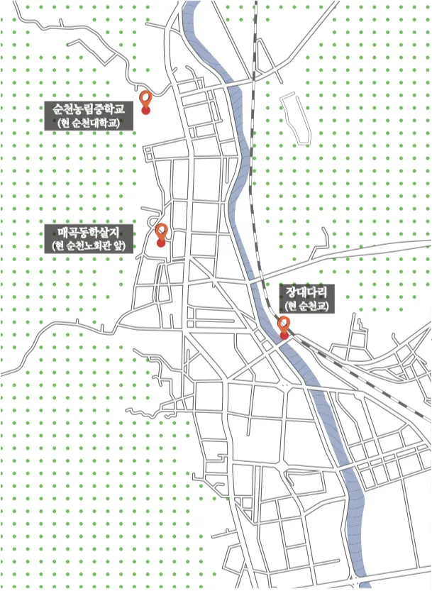 가뜩이나 경찰에 대한 분노가 쌓여있던 병사들은 맞공격을 시작했다. 경 찰은 적수가 되지 못했다. 14연대에는 제주도 진압작전을 수행하게 하기 위해 당시로서는 최신 무기인 M1 소총이 지급된 터였다. 수적으로나 무기로나 열세인 경 찰은 후퇴해야 했다. 역사는 때로 우발적인 사건 또는 아이러니를 수반한다. 독일 의 통일도 베를린 장벽을 관리하던 관리자의 실수로 문이 열리며 물꼬가 터지지 않았다던가. 예부터 순천의 군사적 요충지였던 장대다리에서의 첫 전투에 승리 한 병사들은 순천 시내로 진군했다. ‘여수항쟁’이 ‘여순항쟁’으로 확장되는 순간이 었다.