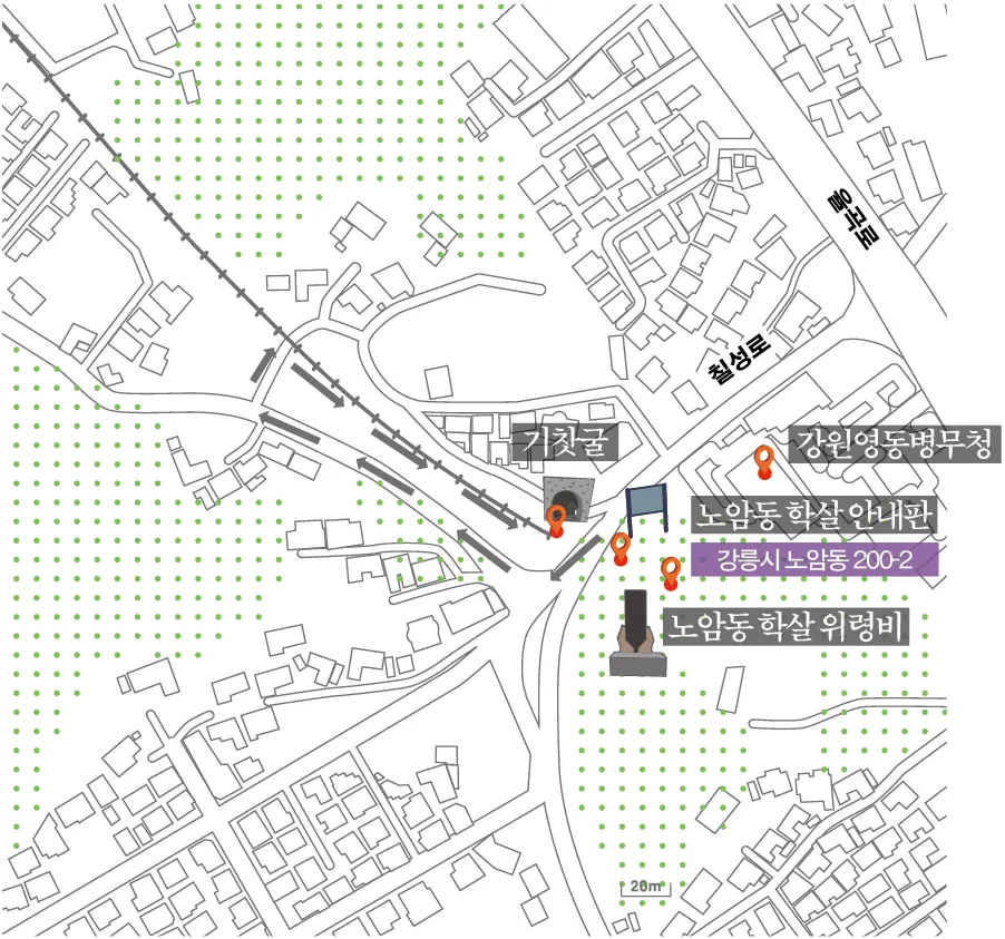 강원영동병무청 뒤쪽 작은 언덕을 올라가면 북한군에 의해 죽은 반공인사 를 추모하는 비석이 있다. 학살 현장은 언덕 바로 아래를 통과하는 기찻굴이다. 지금은 기찻굴 주변에 산책로가 조성되어 있다.