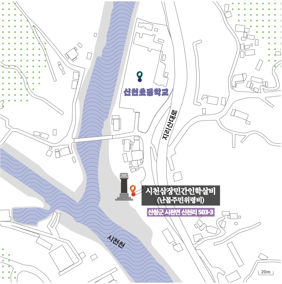 위령비는 학살이 있었던 신천초등학교에서 멀지 않은 시천천 천변에 세워져 있다. 난몰주민위령비(亂沒住民慰靈碑)라는 이름이 주는 느 낌은 다른 지역의 민간인 희생자 위령비를 보았을 때의 느낌과는 사뭇 달 랐다. 위령비에는 건립일이 광복 50주년이라고 쓰여 있었다. 1995년이면 아직 가해자가 한국군이라고 공공연하게 밝히기 어려웠던 시절이었던 걸까. 그랬기에 난리(亂)통에 일어난 죽음(沒)이라고밖에 쓸 수 없었을 것이다. 난몰이라는 이름에서 꾹꾹 눌러 담은 서글픔이 묻어나는 것 같았다.