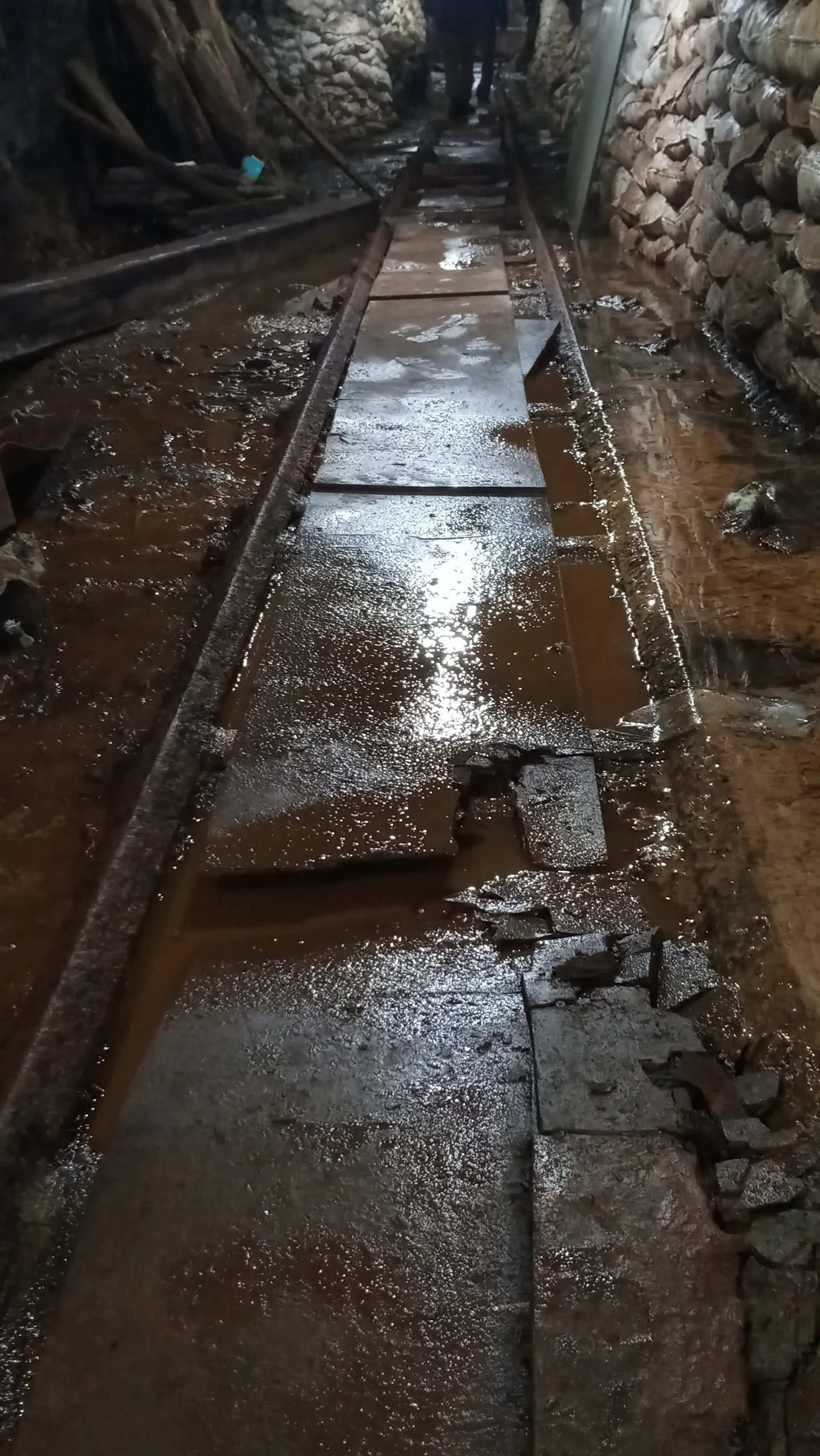 코발트광산 내부 갱도에 물이 차 있다. 선로는 유해발굴을 위해 설치한 것이다.