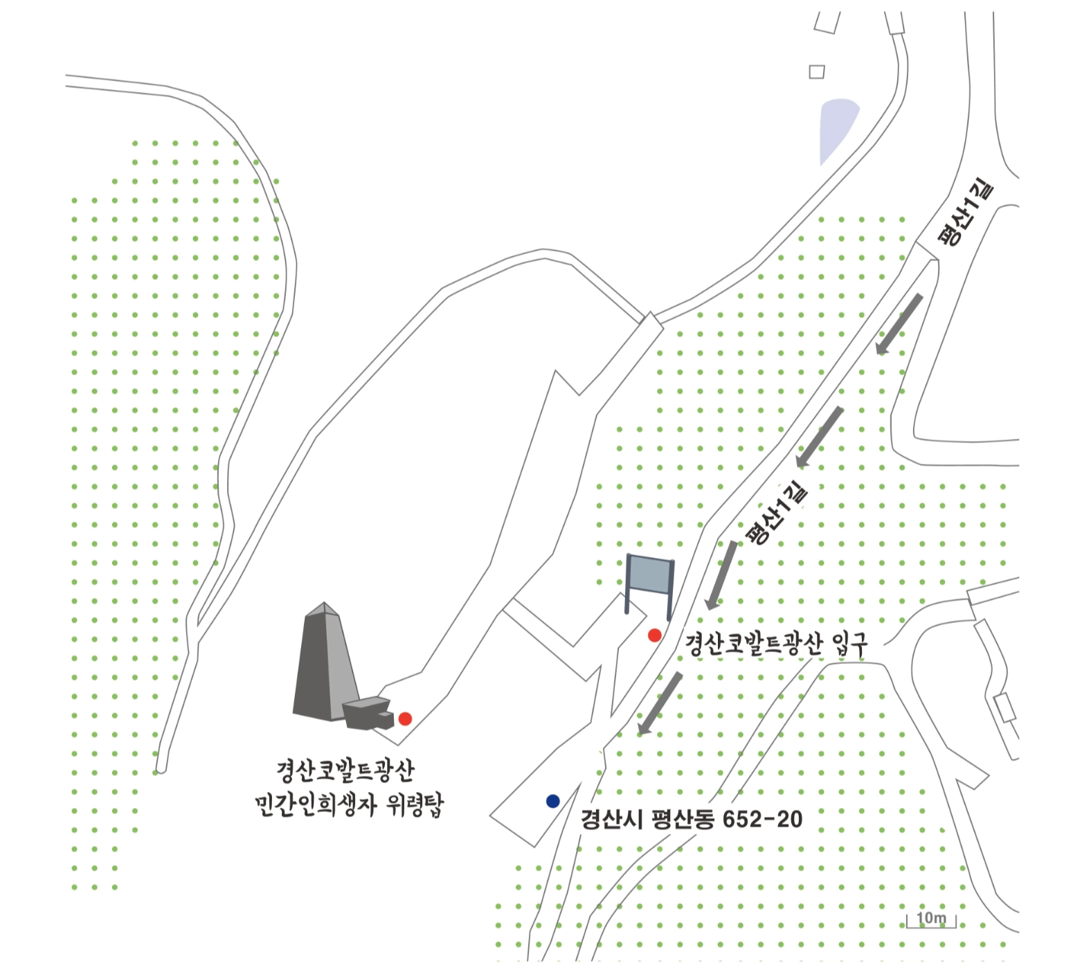 현재 경산 코발트광산의 입구, 한국전쟁 당시 제2수평갱도라 불리던 이곳의 입구는 철문으로 굳게 잠겨 있다. 우익단체가 광산에 들어와 행패를 부렸던 까닭이다. 심지어 위령비에도 훼손된 자국이 남아 있다.